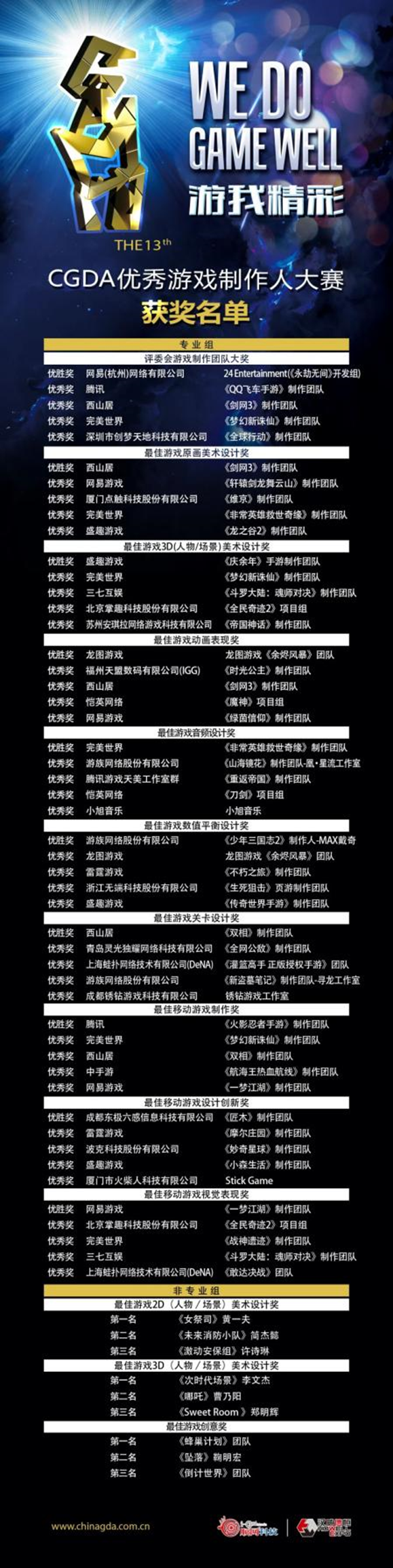 CGDA优秀游戏制作人大赛自2009年起已连续举办十余年,是中国境内举办的针对优秀游戏制作人或团队的评选比赛。本届CGDA共设立了13个专业组及非专业组奖项,评委团由全球顶尖的游戏公司和院校的专家组成,经过专业评析推选出专业组和非专业组各类奖项,涵盖了游戏制作美术、动画、音乐等游戏研发过程中的方方面面。