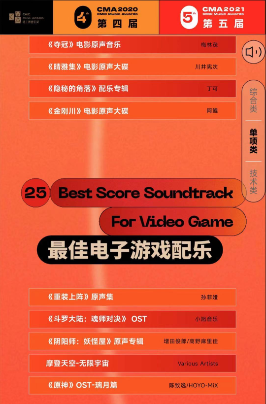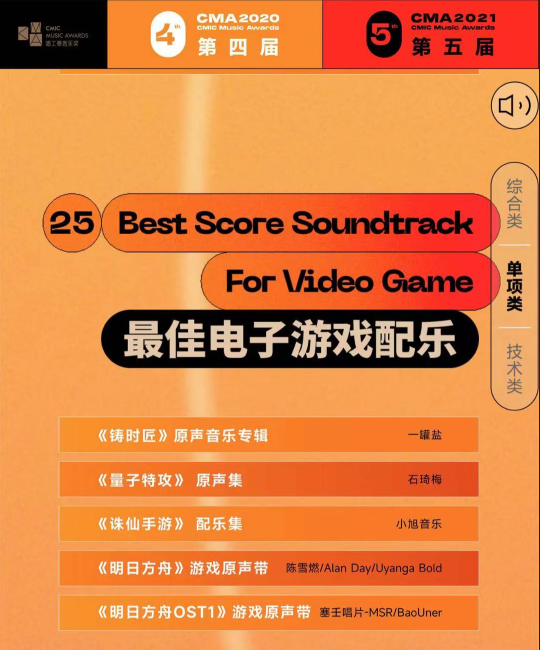 小旭音乐作品《诛仙手游》和《斗罗大陆 魂师对决》的音乐,分别入围两届大奖的“最佳电子游戏配乐”的提名奖!2019年和2020年的 “最佳电子游戏配乐”奖项,有20多部国内一线的游戏(原神、明日方舟、阴阳师等超一线作品)配乐参加,包括腾讯、网易使用国外大牌的音乐团队作曲的作品。小旭音乐作品能两届均入围,脱颖而出,充分证明了我司配乐水平,在国内游戏音乐中的领军地位!
