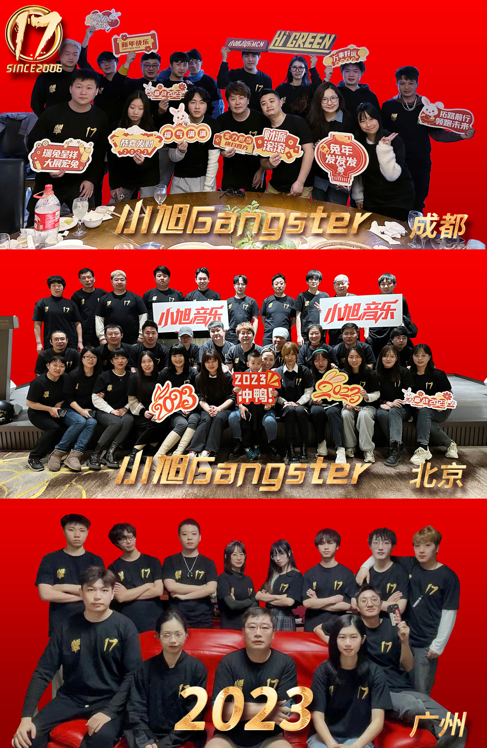 兔年 小旭音乐·北京总部、成都分部、广州分部,开工全家福。十七载风风雨雨,一起度过艰难2022。2023少说多做,把三年失去的都努力争取回来。游戏音频+抖音直播,两条战线,北京、成都 、广州的同学们,一起加油。